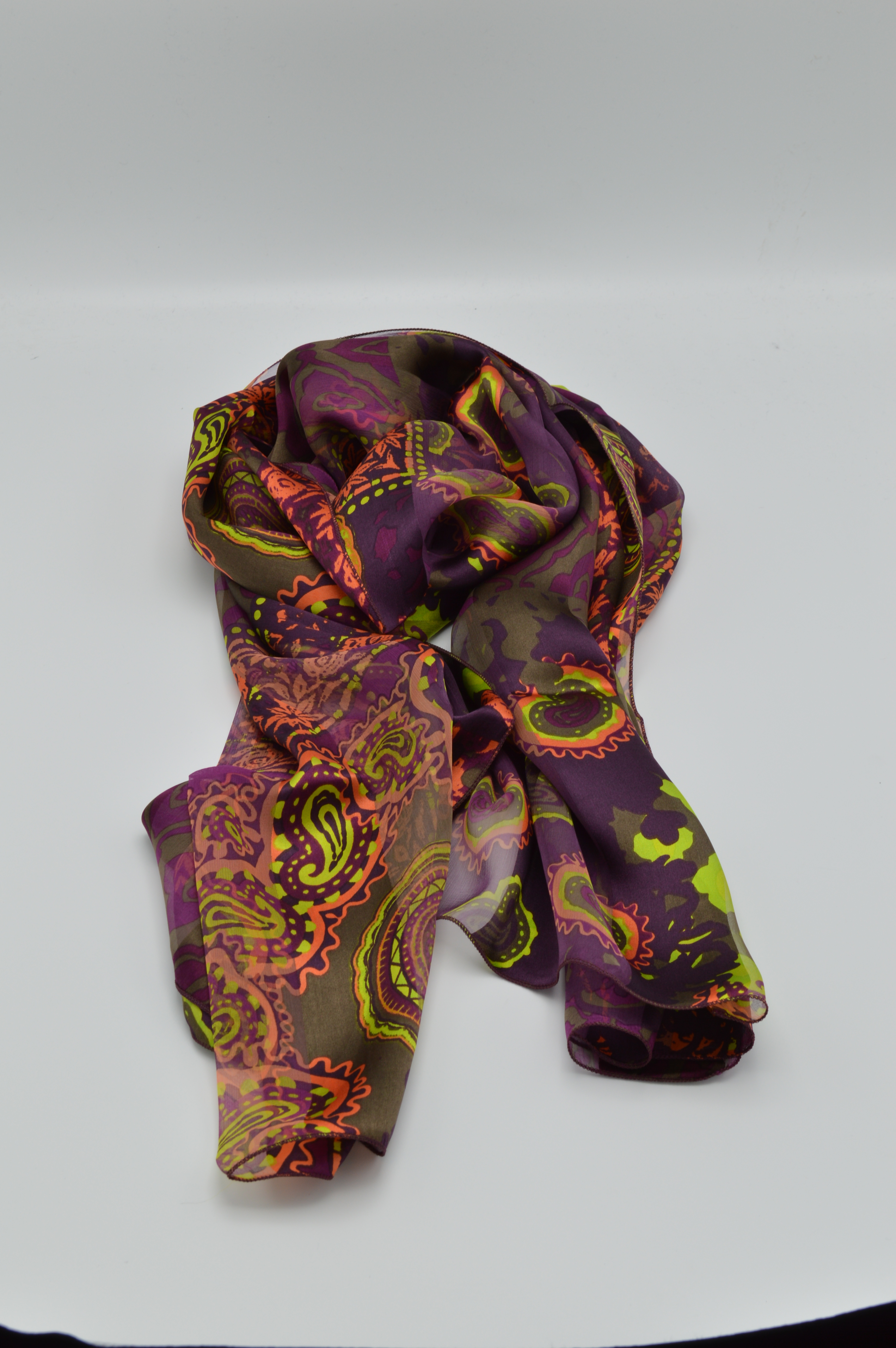 Deze sjaal bestaat uit 100% zijde.  Ze is 60 cm breed en 160 cm lang.