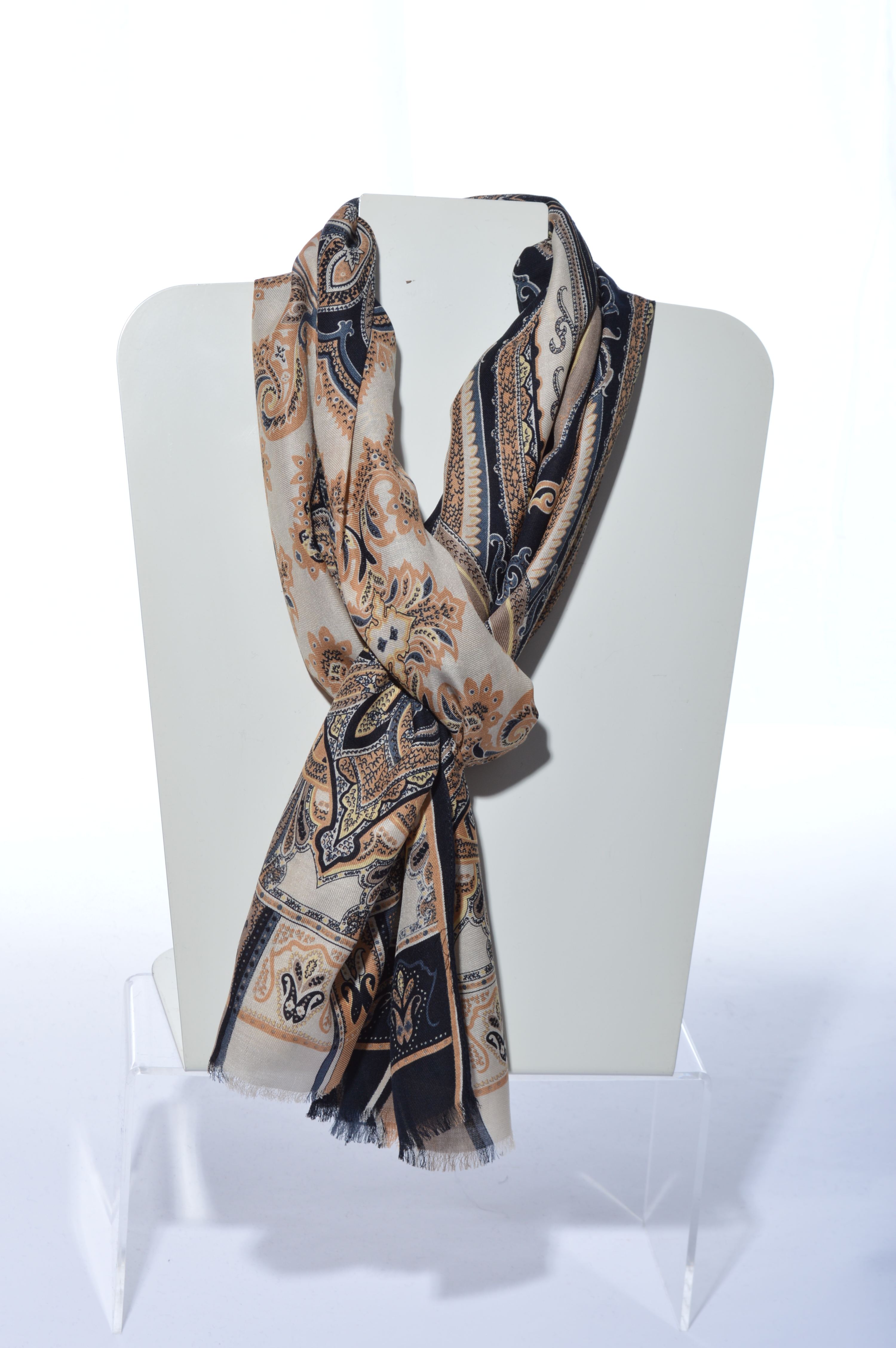 Deze sjaal gemaakt in Duitsland bestaat uit 90% modal en 10% cashemere.  Hij is 180 cm lang en 45 cm breed.